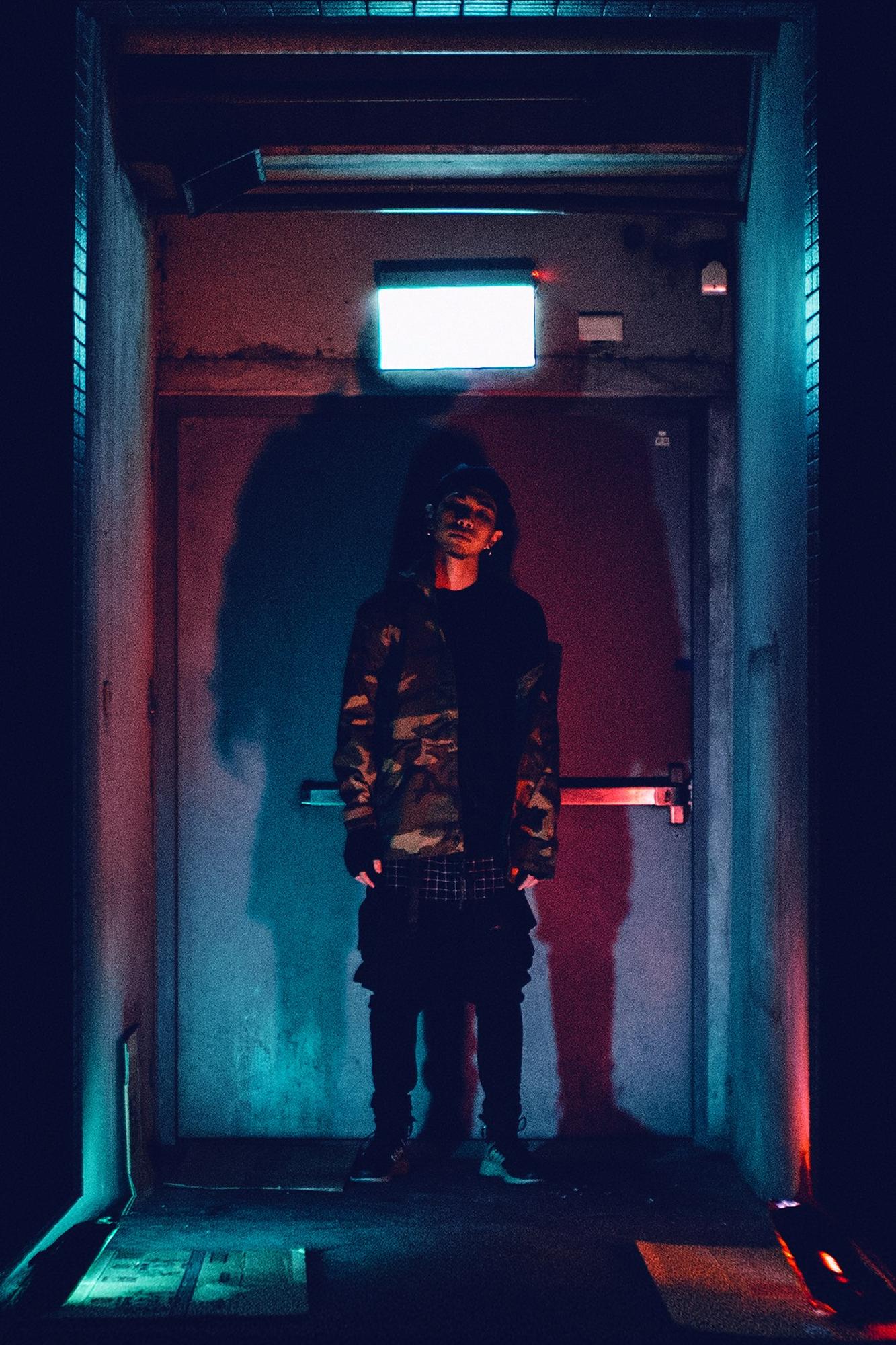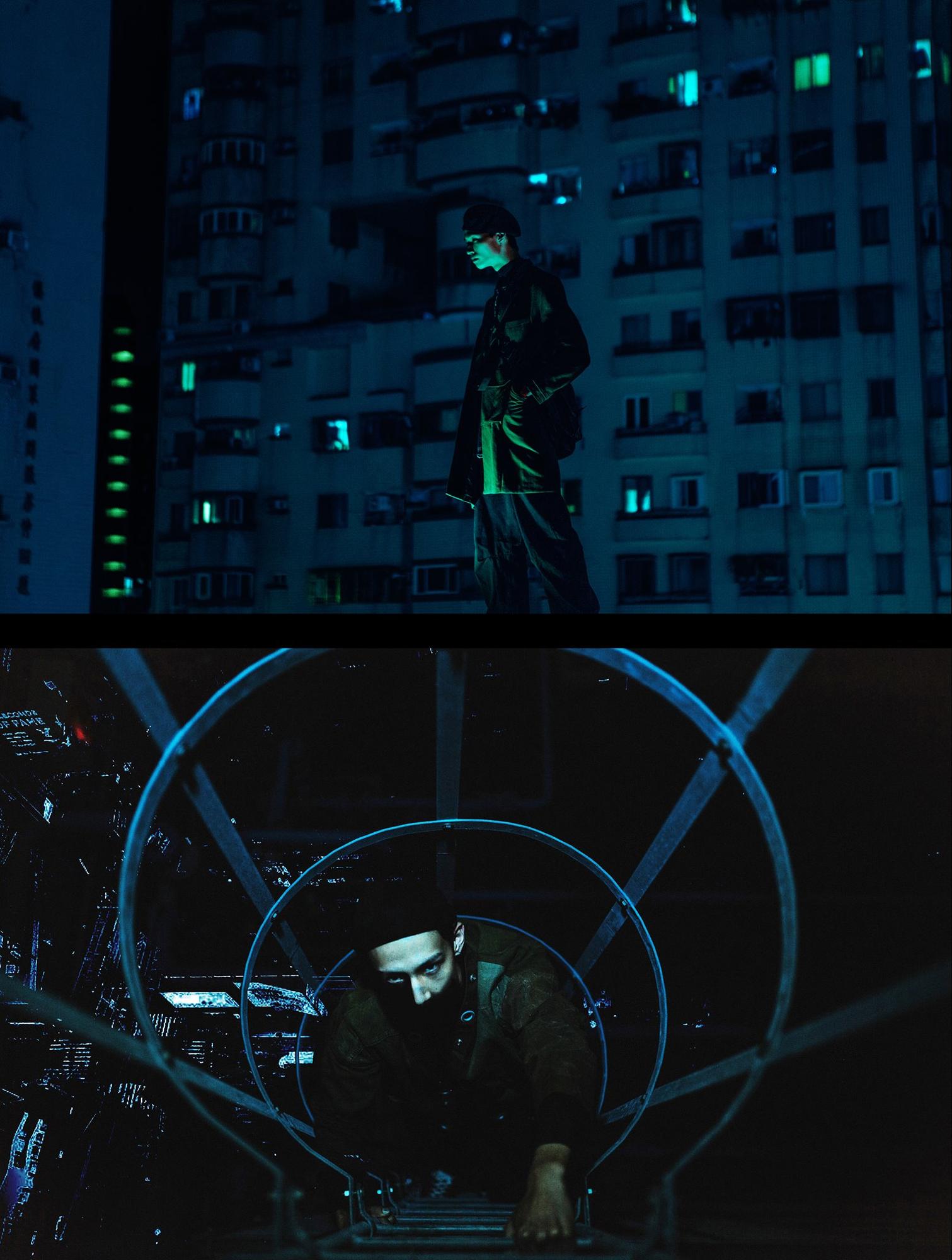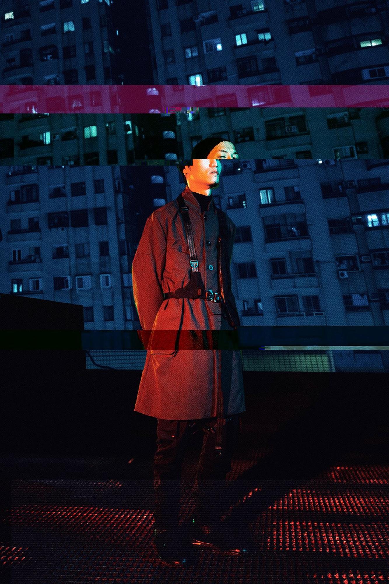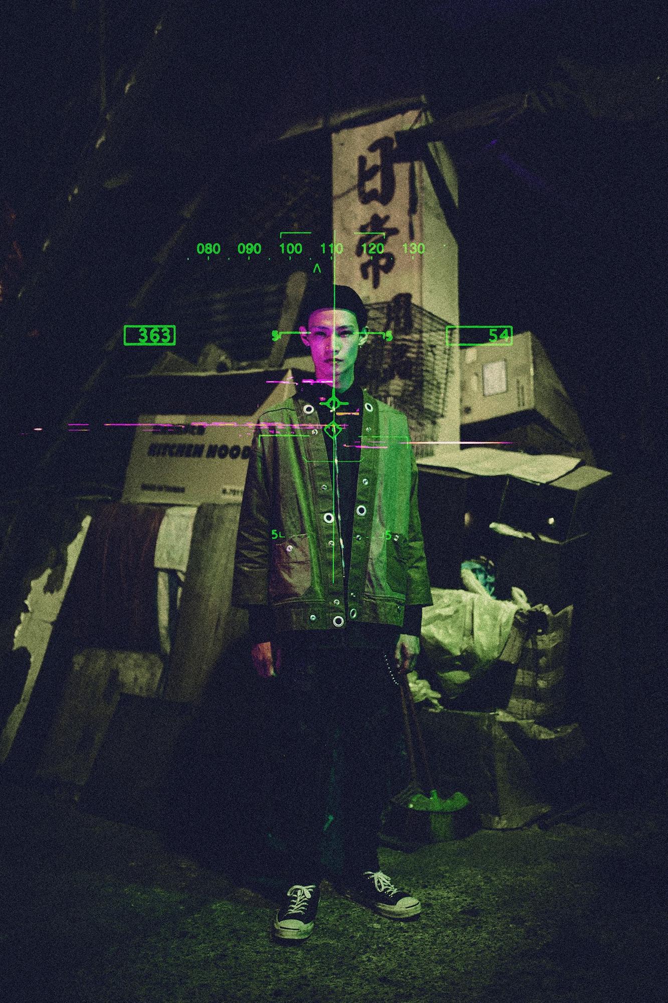 「 The truth between the world and our existence is most clearly reflected when we are lost in our inner unsettlement or moments of terror 」 How shall we dress then in the future? Shall we pursue clothes with extremely progressive functions, or shall we pause and returned to the old-school fashion? Our shooting concepts are derived from the evoluted Cyberpunk and the continuing of those old military costumes in the pessimistic world where there is a lacking of supplies causing a time and space delusion to the outfits. Functional clothing, an extension of reused military outfits, and government issued vintages. We take “military wear“ as the media to connect the past to the future, juxtaposing the old and the new, and resonating it with cold and hard texture of metallic accessory which brings out a industrialized sensation. There seems to be no bright technology in a dystiopian setting. Billowing clouds comes from polluting gas from factories. All sources of messy neon lights seems to be pretentious, while suffocating steel skyscrapers approach, and rusty pipelines rages in the city. Noisy bumping sound of machineries and are heavy breathing of consumed citizens are the standard soundtrack of this dark city.