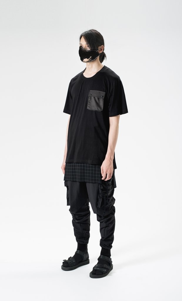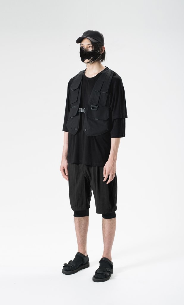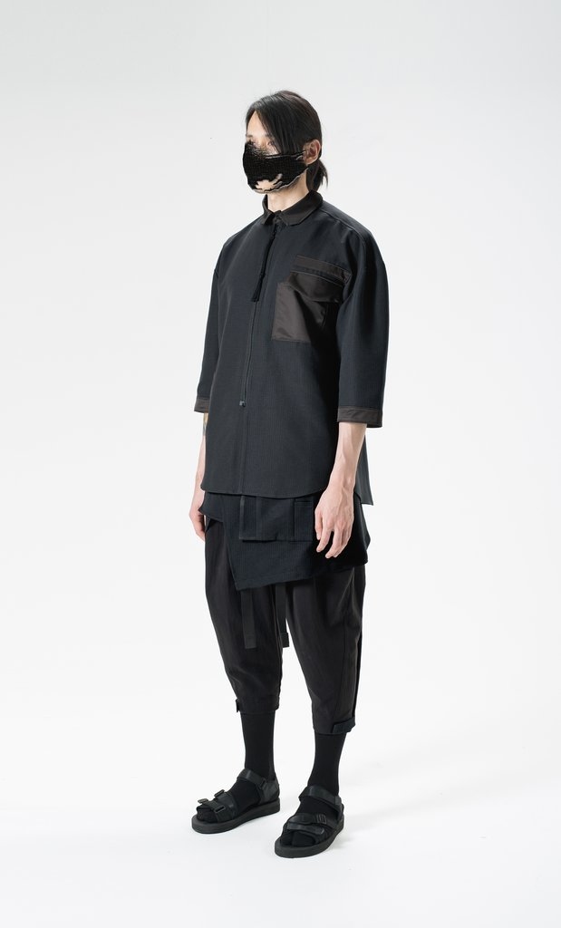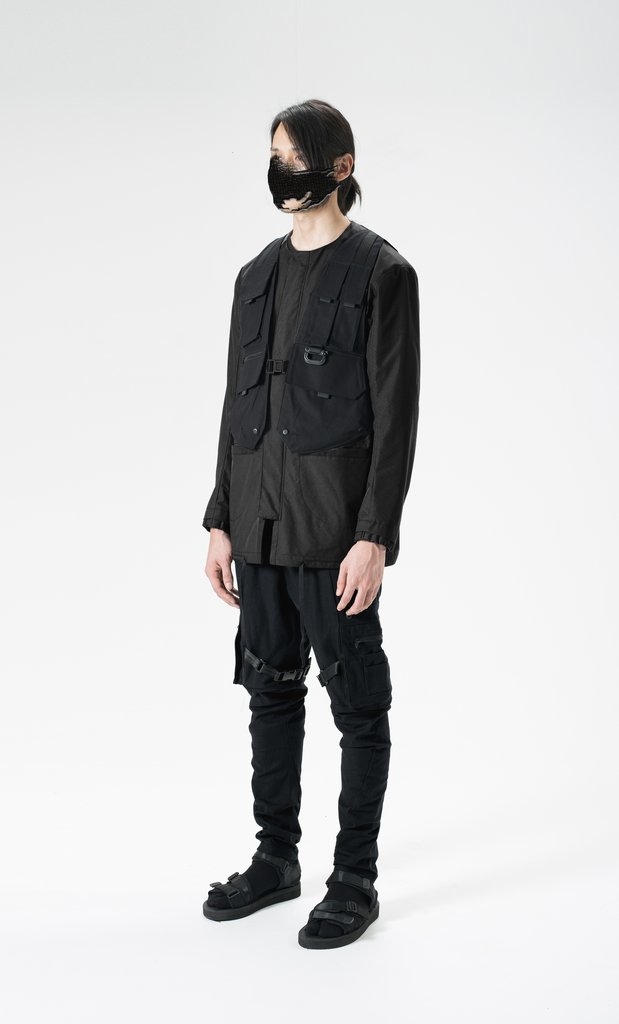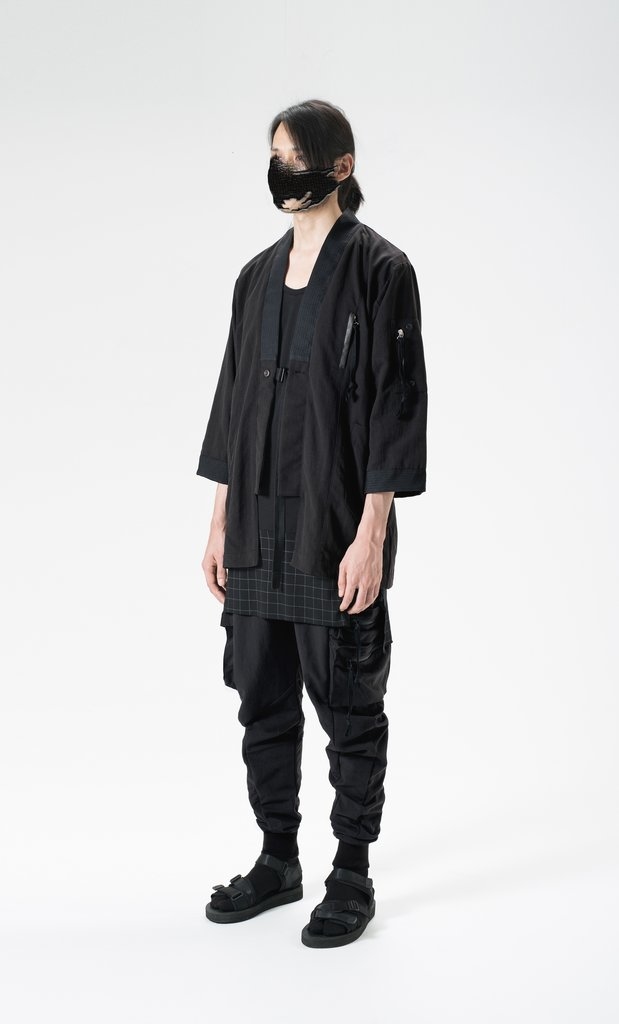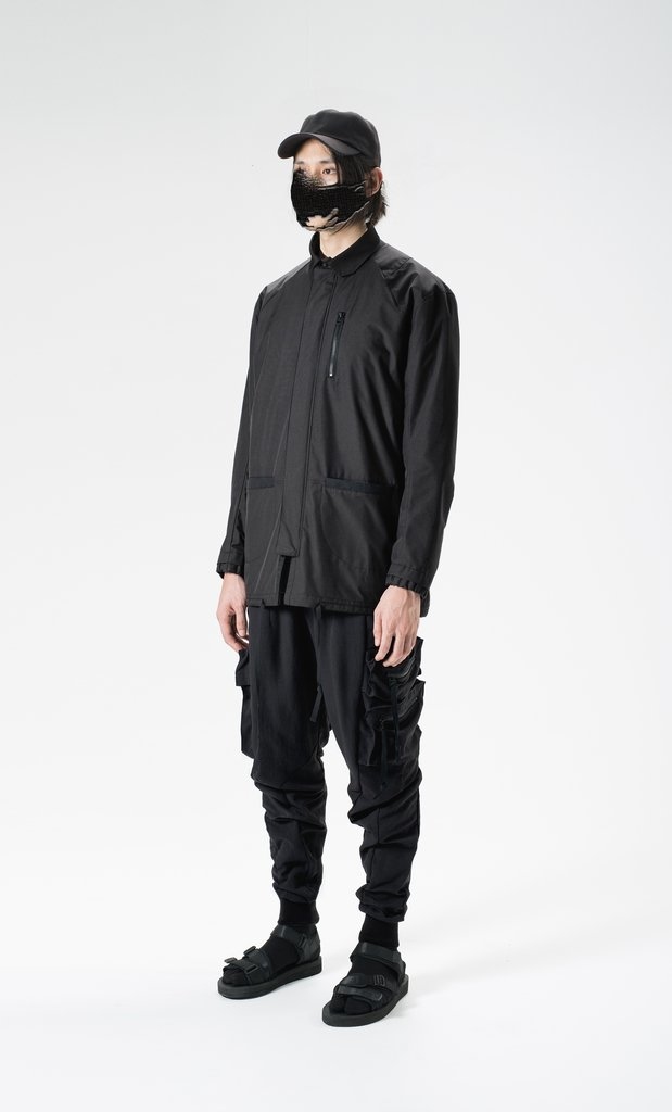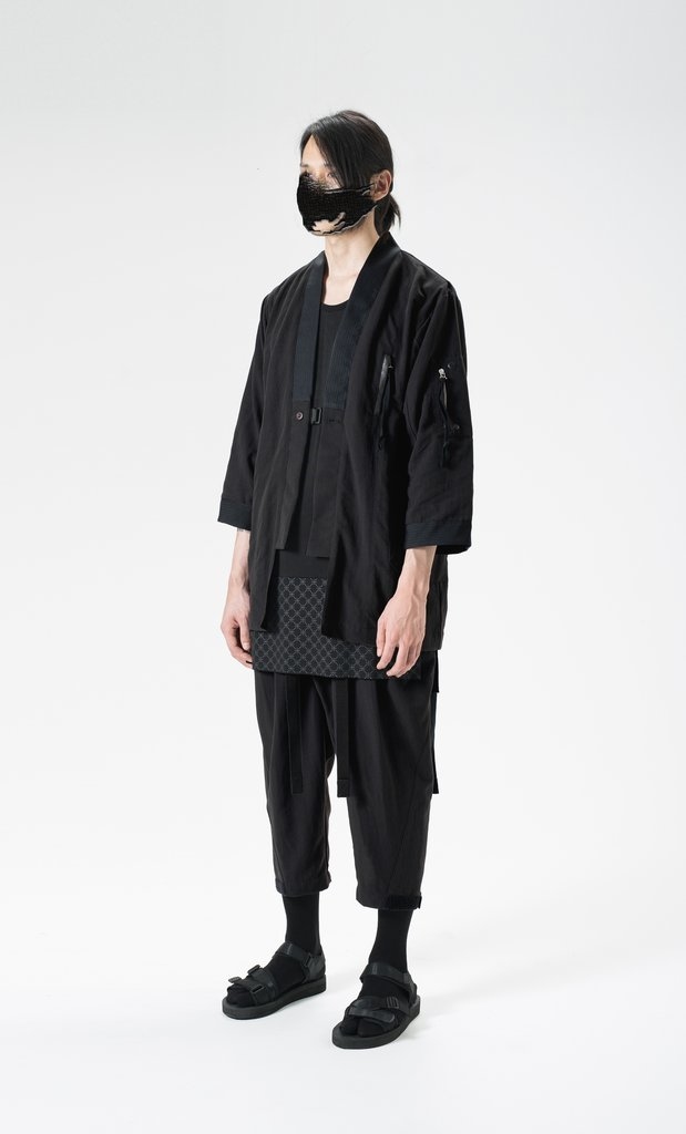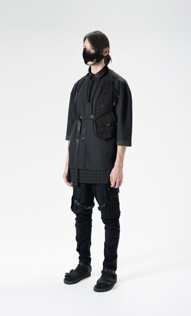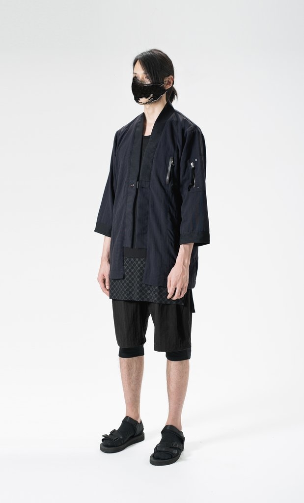 Landing in between historical frames and modern reality of the time space continuum, the new collection attempts to retain the fundamental nature of traditional garments while fast forwarded into a setting of futuristic design. EYES & SINS and its technical militaristic framework becomes romantically fused with traditional Japanese aesthetics such as utilizing sashiko patterns, pleating, and oversized layered garments for a resilient yet quiet look.