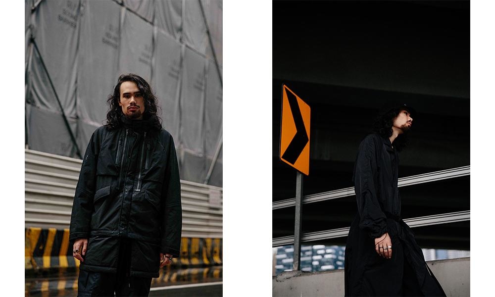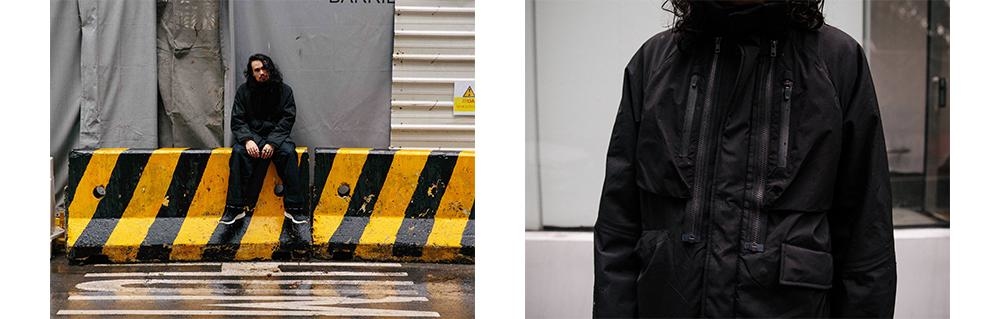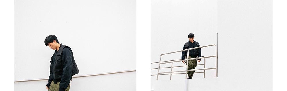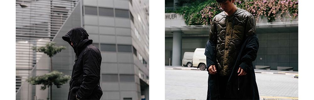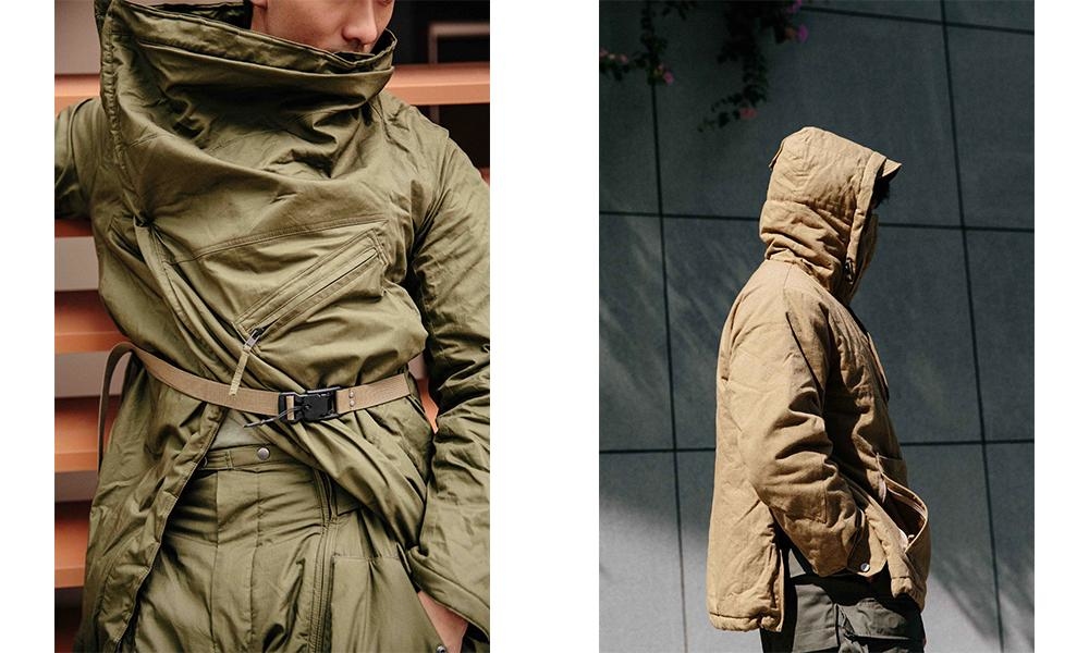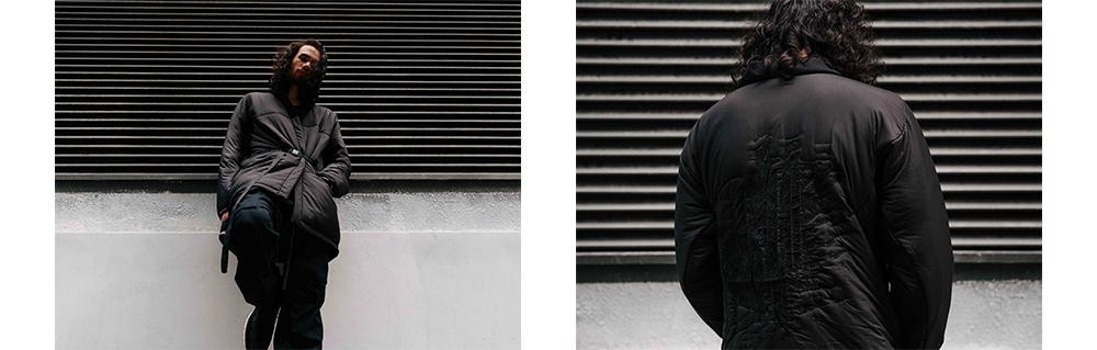 ADDITIONALLY, A SIMPLE COLOR PALETTE OF BLACK AND EARTH-TONES MAKE UP THE RANGE WHICH IS SEEN ON THE LAYERED JACKETS, BOMBERS, AND NOGARI-STYLE PIECES. THE TROUSERS ARE A TRUE STANDOUT AS WELL AS THE QUILTED LINER IN AN OLIVE HUE.